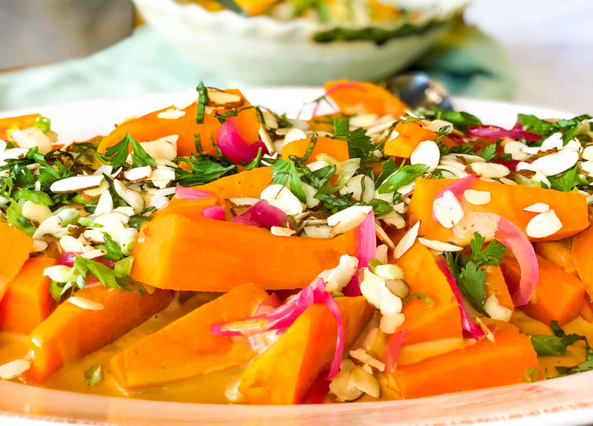 Drizzle sauce over peeled and cut sweet potatoes, sprinkle with sliced almonds/cashews or peanuts, chopped scallion and herbs (cilantro and/or basil).