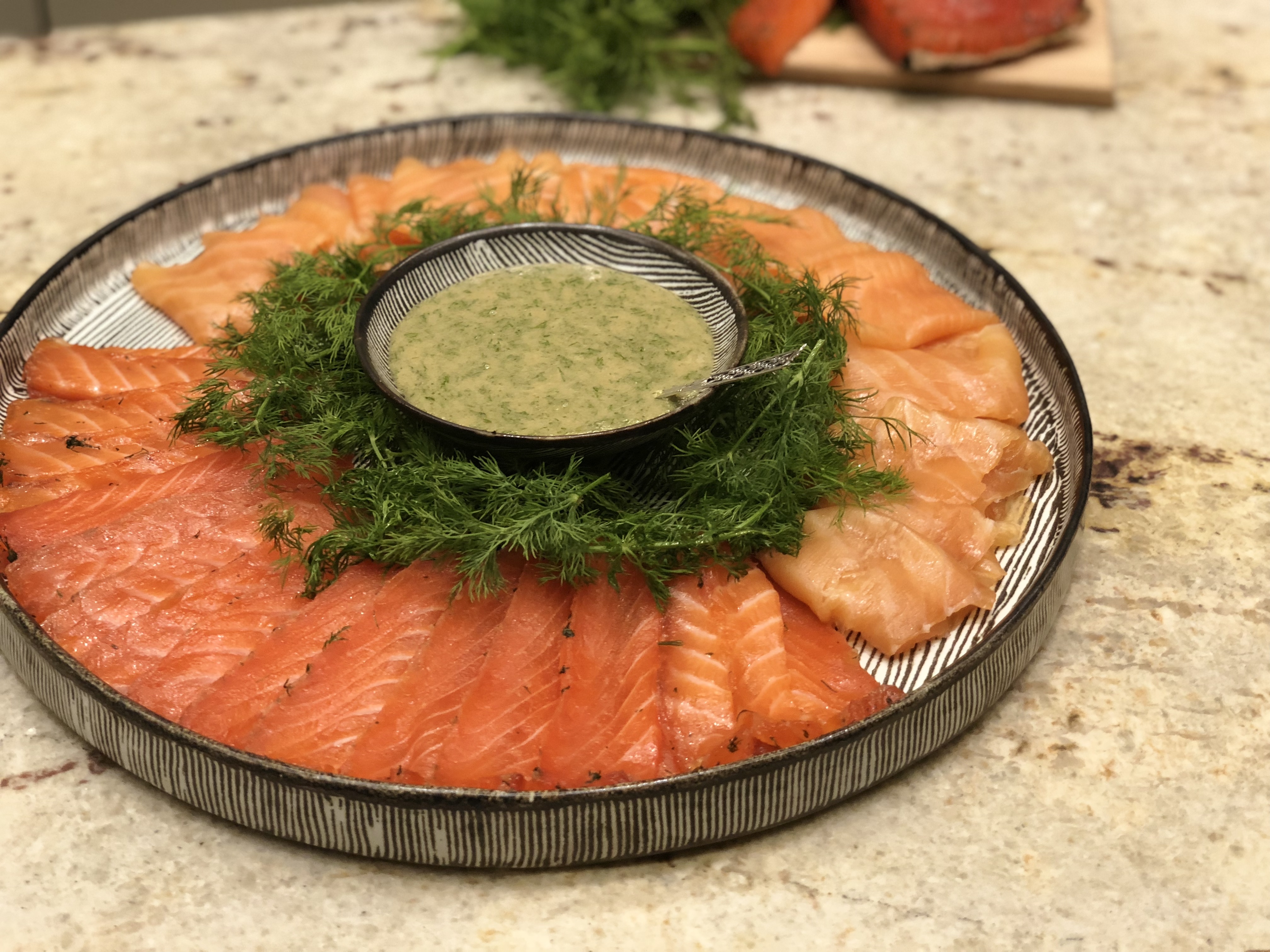 When the salmon is ready, remove it from the fridge, take away the plastic wrap and using your hand - gently wipe away the excess salt mixture or any lumps of dill that are remaining on the salmon. Do NOT rinse the salmon!! When ready to serve, slice thin pieces away from the skin and place onto a platter. Enjoy with toasts, bagels, traditional mustard sauce, cucumber yogurt, eggs.... there are so many options! Feel free to email me if you need any inspiration or ideas for how to present your platter of Gravlax. Enjoy!